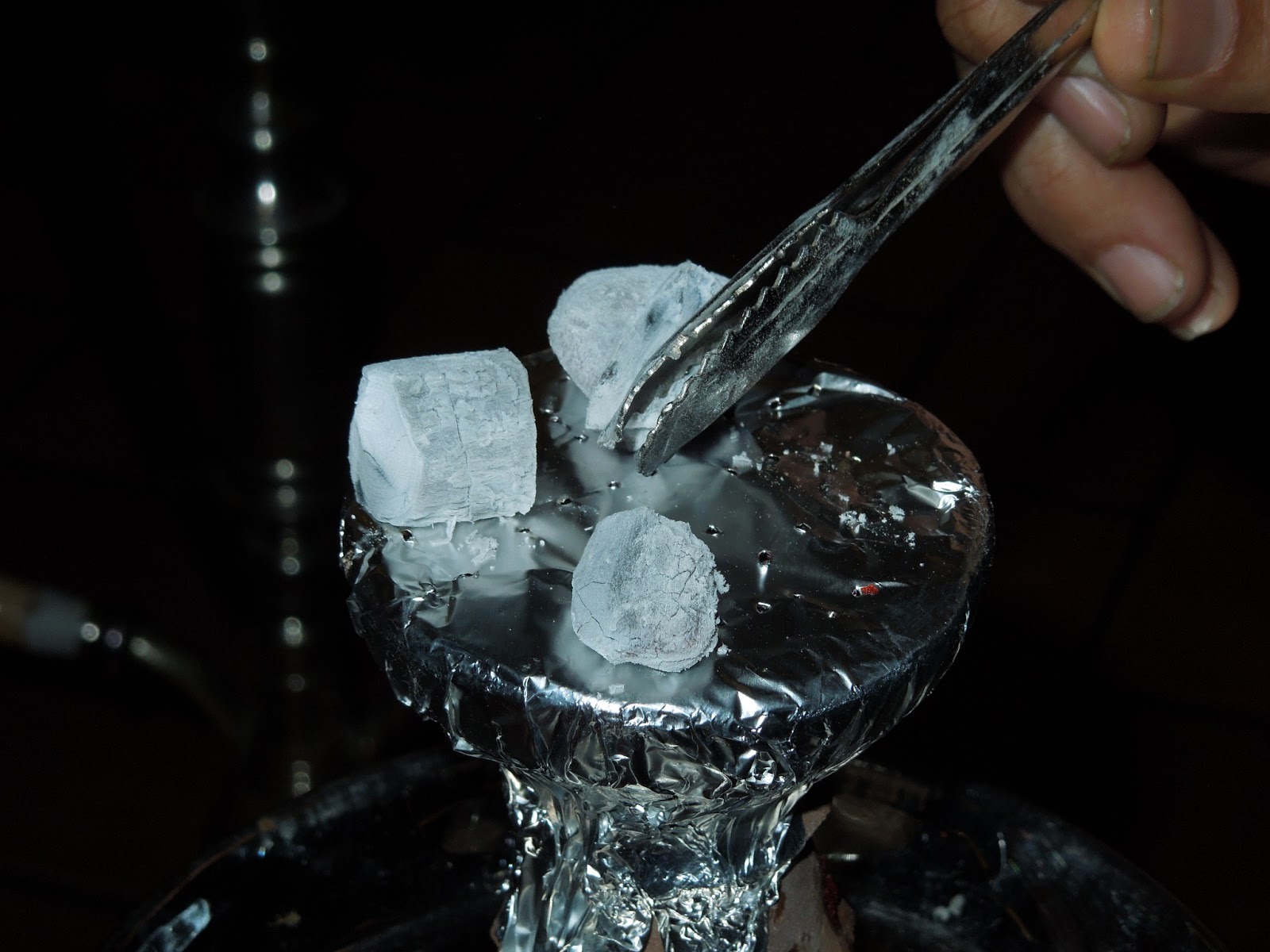 | This looks so scientific! The coals atop the tobacco. While the waiter spreads them about Kheiriddine rearranged them on one side which makes the tobacco last longer |
